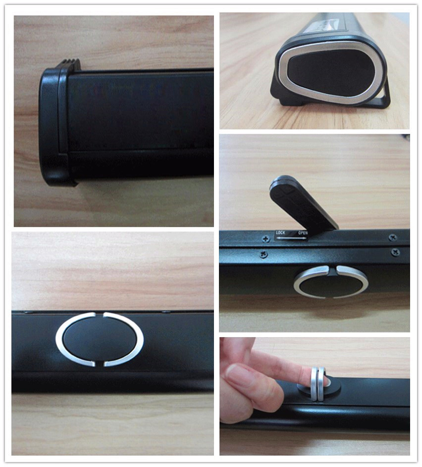 ★ 黑色合金外壳,触动式内嵌锁扣按键可令银幕自动开合,控制携带时锁合松开,弹簧连杆打开结构能将银幕向两边张开并固定,同时让屏幕保持平整。