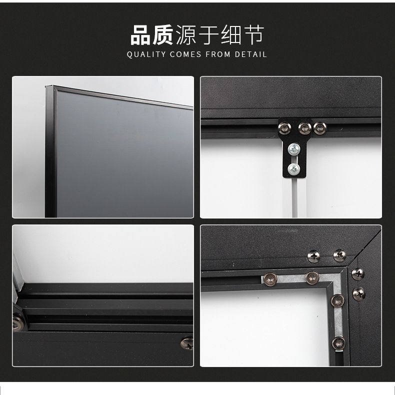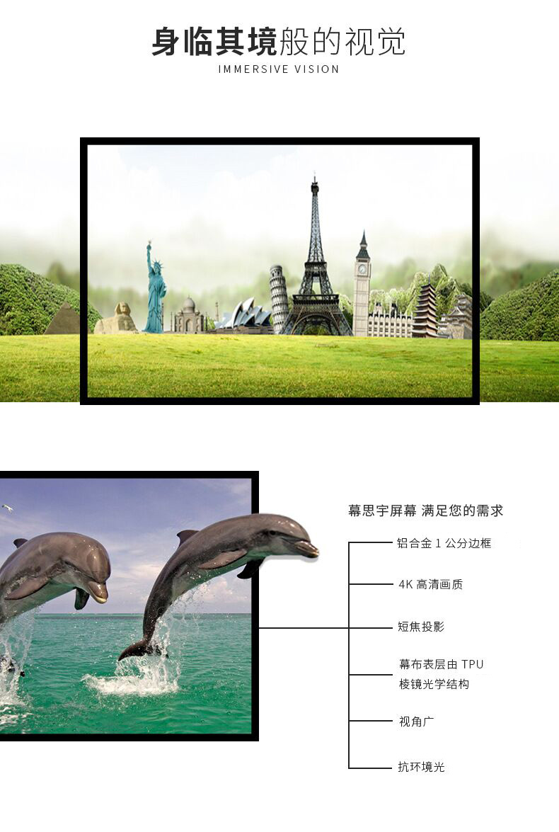 1公分哑光黑色铝合金边框,屏幕组件由微棱镜结构,该结构包括多层光学层。屏幕微棱镜结构把投影机光束反射到观众有效观看范围内,屏幕具良好均匀性;屏幕对环境光进行了过滤,提高了图像对比度,屏幕在明亮环境下也能呈现高清的图像。