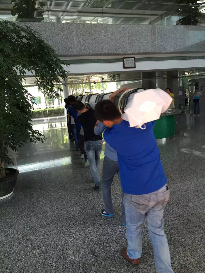 到达安装现场,同事们齐心协力帮运银幕到达安装现场。